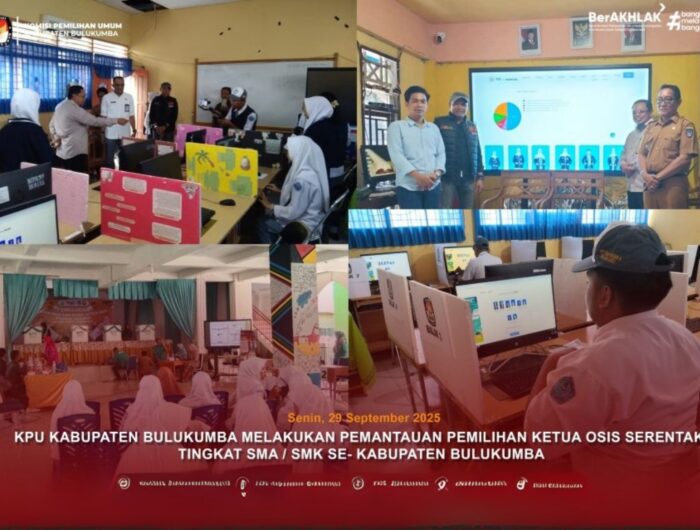 SATUKLIKMEDIA.COM, BULUKUMBA – Komisi Pemilihan Umum (KPU) Kabupaten Bulukumba mendampingi pelaksanaan Pemilihan Ketua OSIS (Pilketos) secara serentak di sejumlah SMA/SMK sederajat di Bulukumba pada hari Senin, 29 Agustus 2025. Sekolah-sekolah yang menggelar pilketos antara lain SMAN 1 Bulukumba, SMAN 8 Bulukumba, SMAN 9 Bulukumba, dan SMKN 1 Bulukumba.