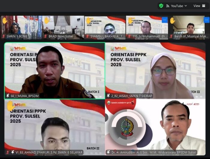 SATUKLIKMEDIA.COM, MAKASSAR – Sebanyak 6.728 Pegawai Pemerintah dengan Perjanjian Kerja (PPPK) di lingkup Pemerintah Provinsi Sulawesi Selatan mengikuti Orientasi ASN PPPK secara distance learning. Kegiatan ini digelar oleh Badan Pengembangan Sumber Daya Manusia (BPSDM) Sulsel sejak Senin, 20 Oktober 2025, sebagai tindak lanjut pengangkatan PPPK tahun 2022–2023 yang belum sempat mengikuti orientasi sebelumnya.